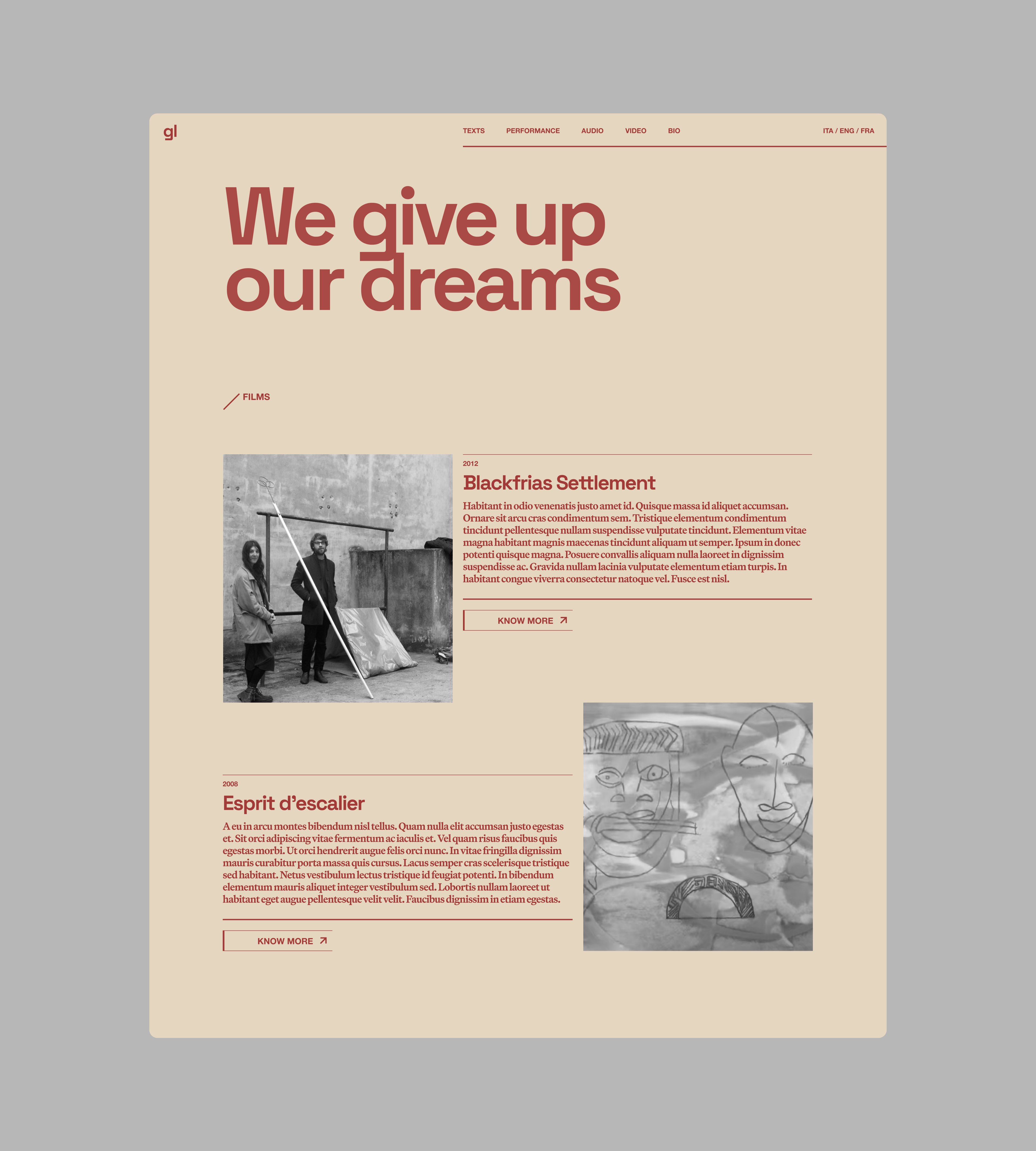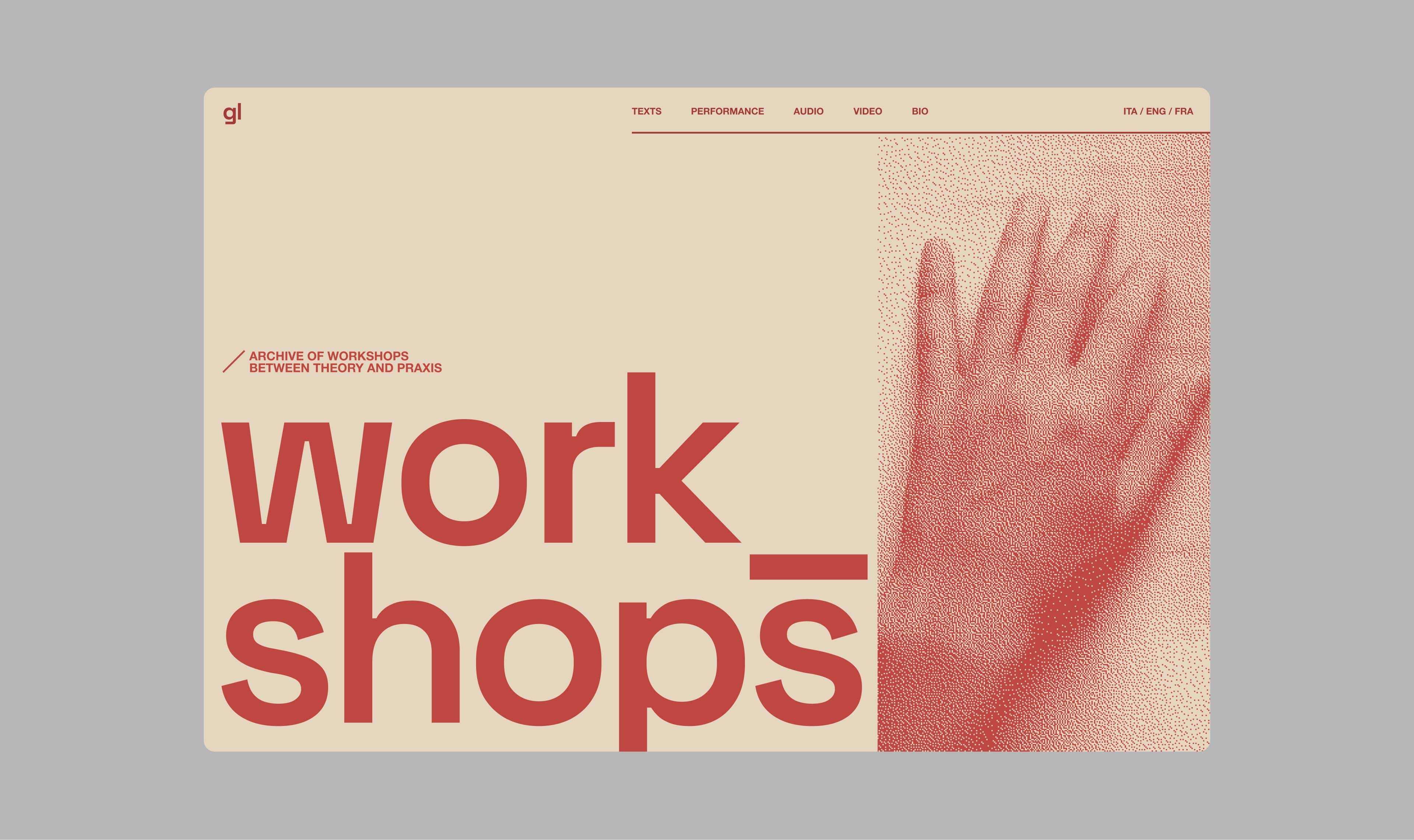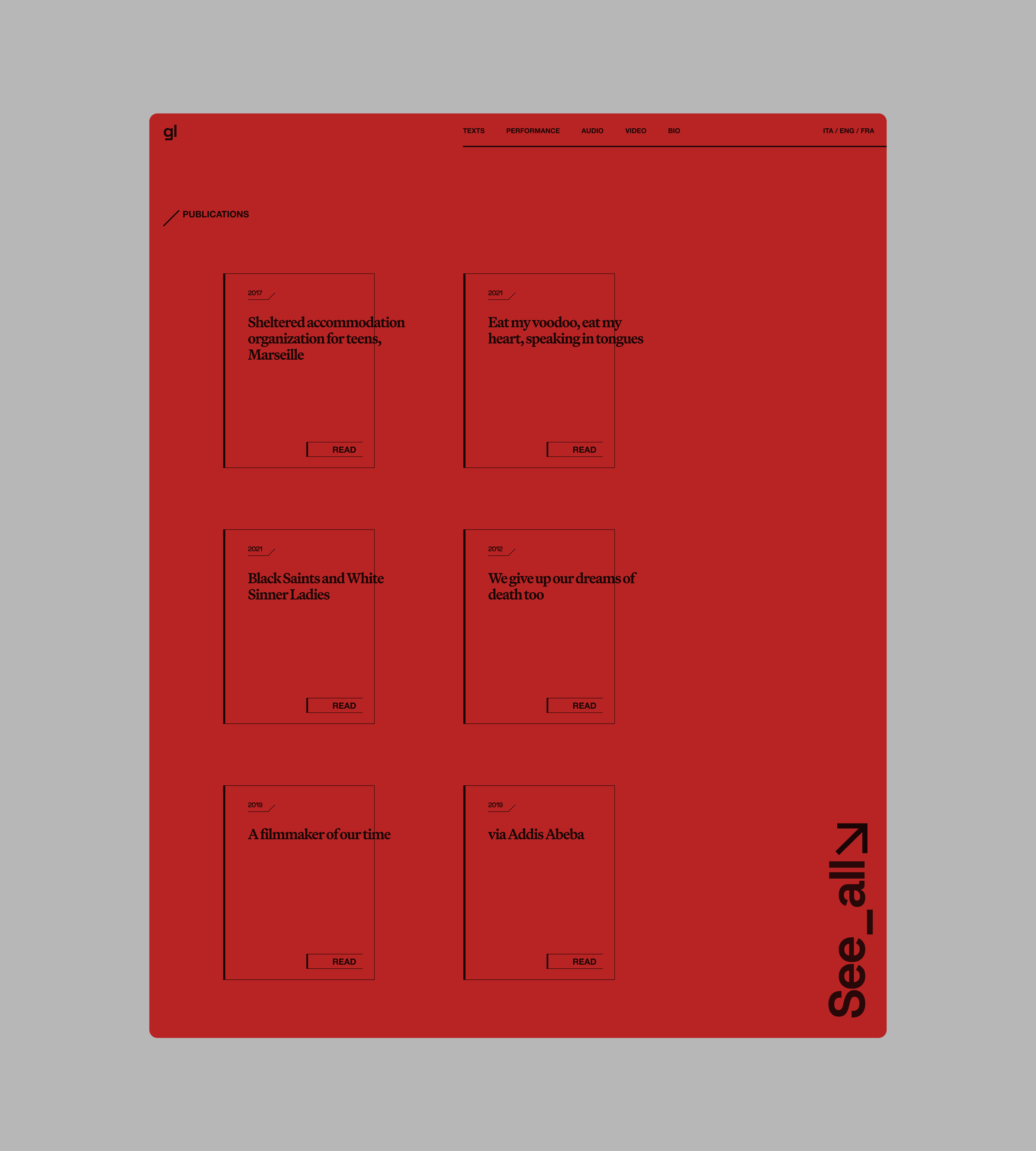 I chose to base the design of the site on the use of a thematic colour for each section, each relating to a field of activity. The typography is set on the use of a font for the headings, with a playful and bold attitude in communication. A second serif font was chosen for the long text bodies, where the writing takes shape and the reference to the publishing world becomes stronger.