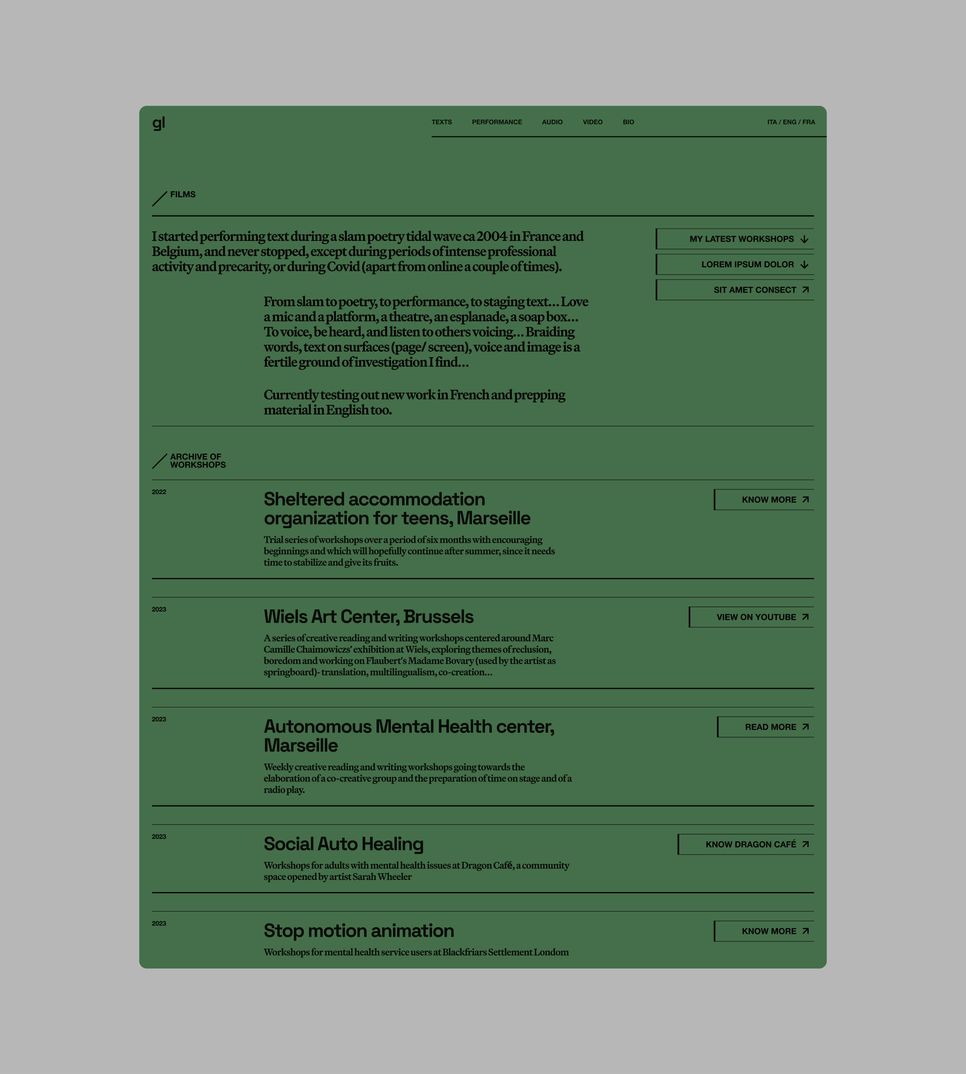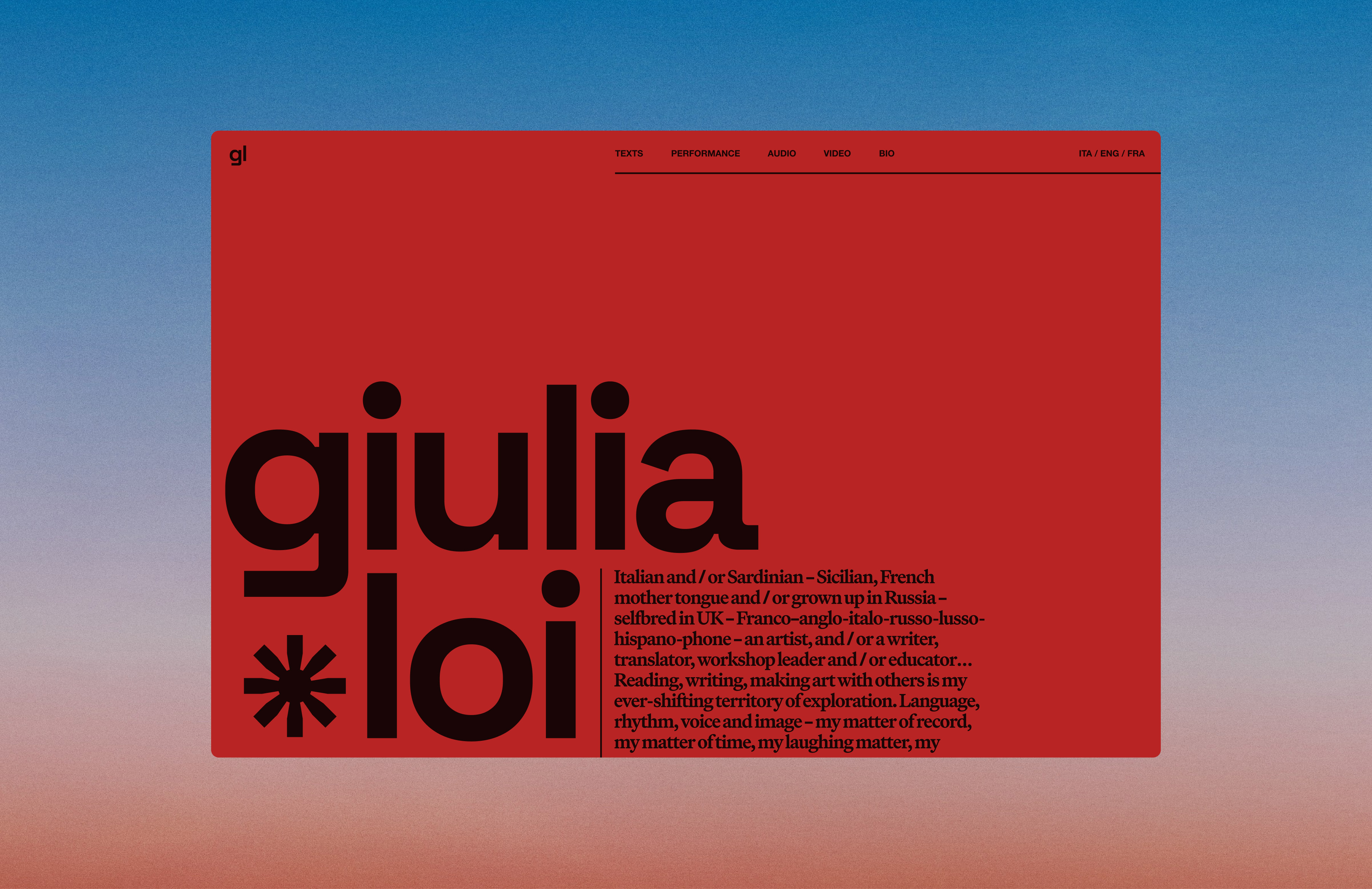 Giulia Loi is a writer and performer active in various fields, from writing novels and poems to public performances and workshops, in different media. Through her online portfolio Giulia wants to show her work but also express her creative personality and style.