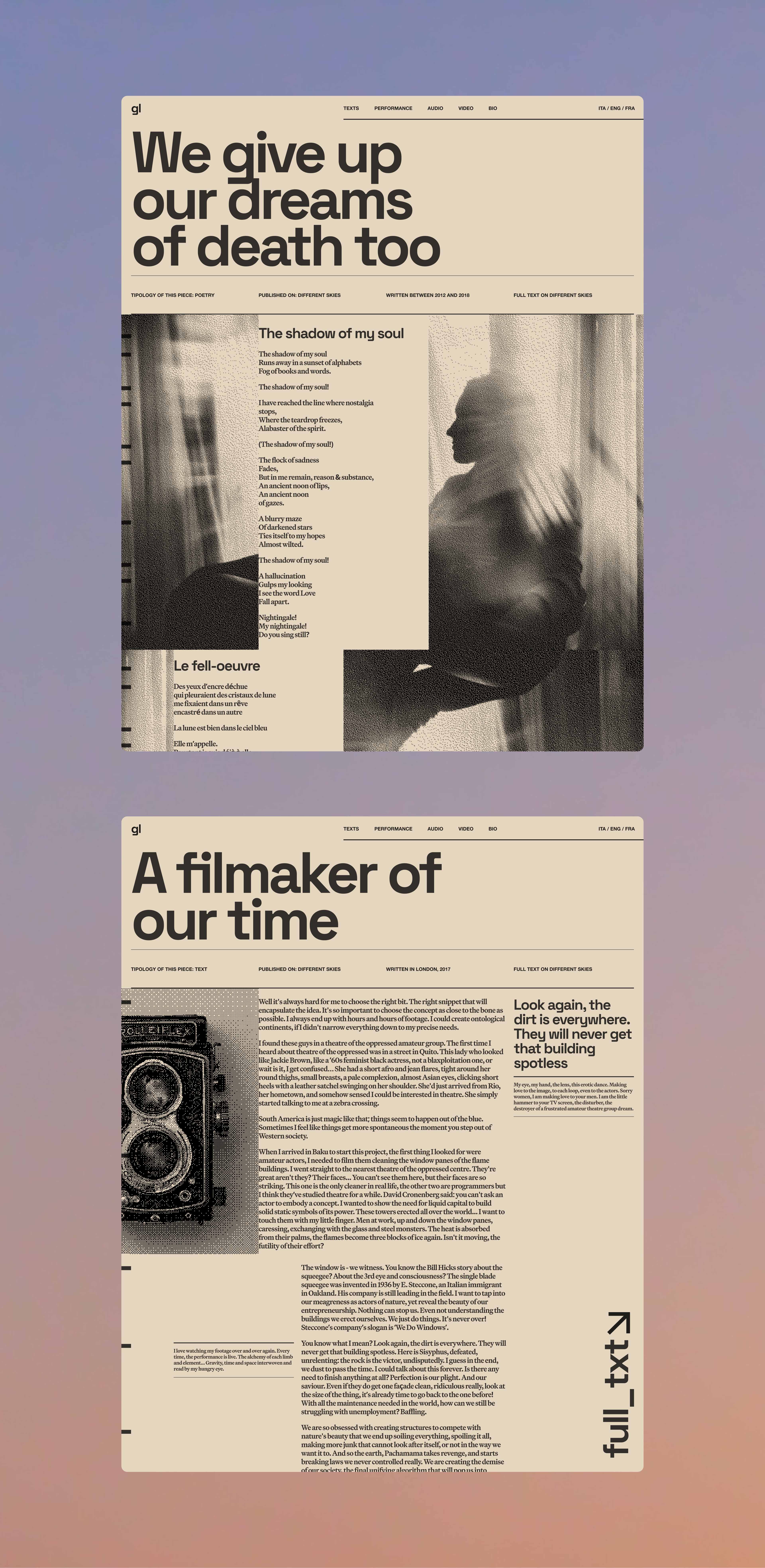 The design of the site on the one hand wanted to express the personality of the subject, colourful but not flamboyant, amused but not superficial. On the other hand, a secondary objective was to bring an editorial tone into the digital medium, relying on the typographic rhythm to hold the attention and accompany the texts and their meanings.